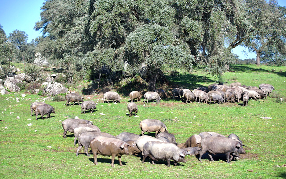 Iberico pork is differentiated from other pigs from its appearance. It is generally black, has pointy ears, is relatively small in body size, and has a lot of muscle. However, the most important thing is how it is raised. Iberico pigs are mostly raised in the wild, and their diet consists mainly of acorns, grass, and in some regions, olives, and various other natural ingredients. The meat of Iberico pigs raised this way has a deep and rich flavor.
